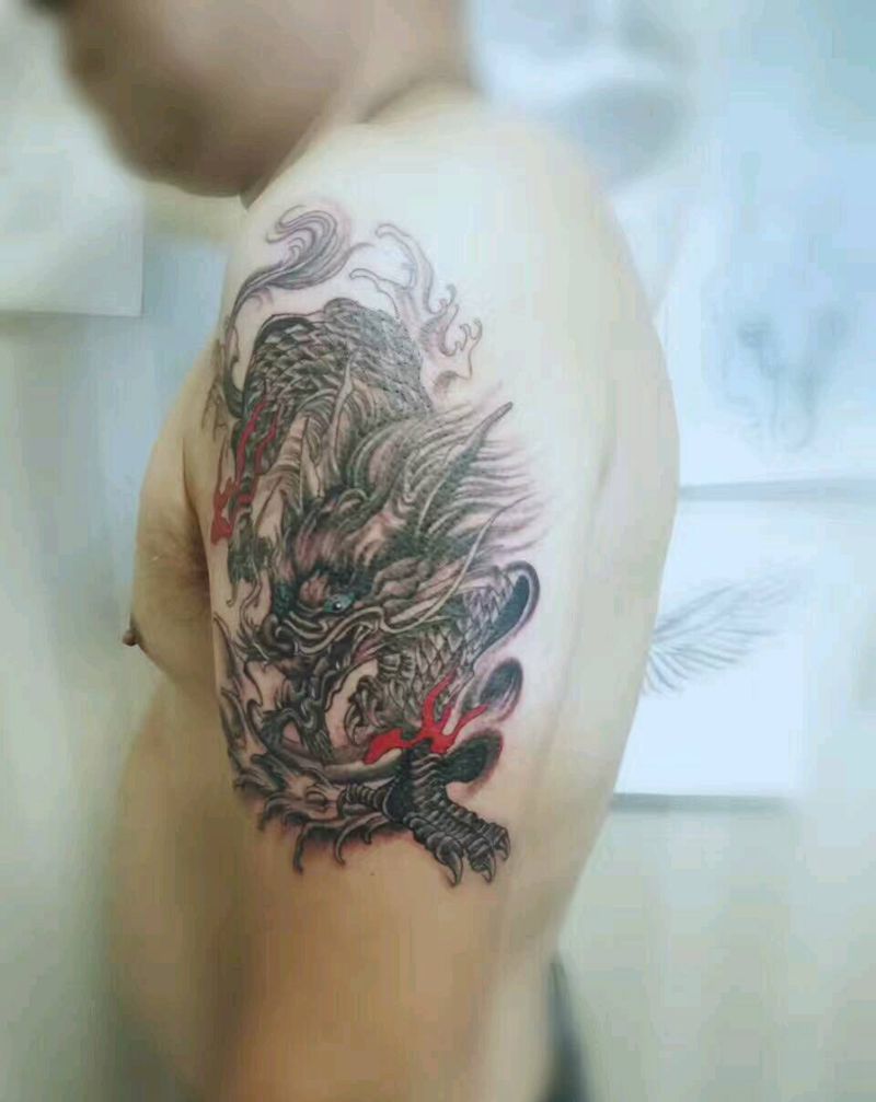 • T网红王老大花腿龙纹身图片_腿部新传统纹身图案