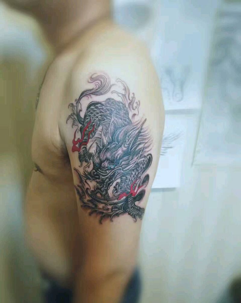• T网红王老大花腿龙纹身图片_腿部新传统纹身图案
