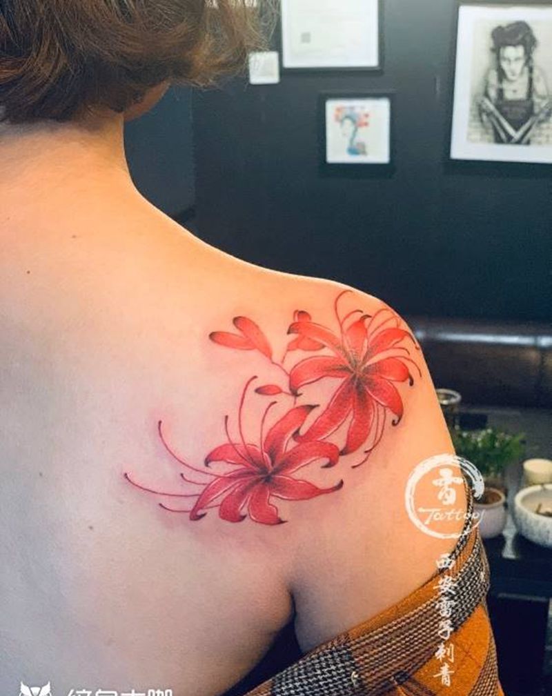当前位置: 首页 >陕西省西安市纹身店-刺青工作室纹身图案>彼岸花纹身图片_肩部背部花纹身图案