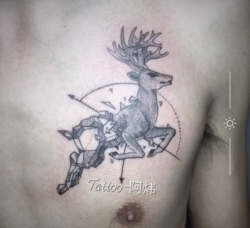 当前位置: 首页 >陕西省西安市纹身店-西安Q魂刺青纹身图案>几何鹿纹身图片_成品胸部清新几何动物纹身图案