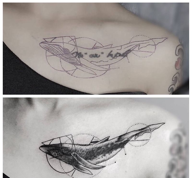 何为鲸落纹身图片_肩部胸部几何点刺鲸鱼遮盖字母纹身图案