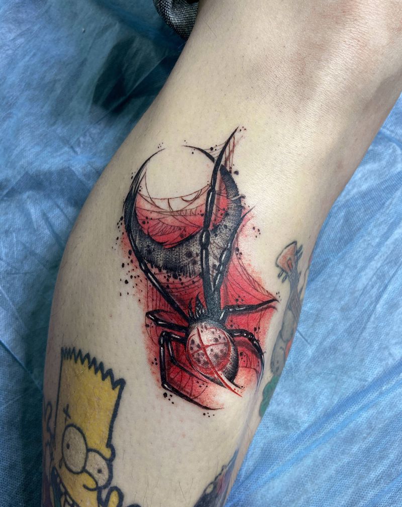 当前位置: 首页 >陕西省西安市纹身店-西安Q魂刺青纹身图案>大几居纹身图片_腿部脚部点刺花体字蜘蛛暗黑纹身图案