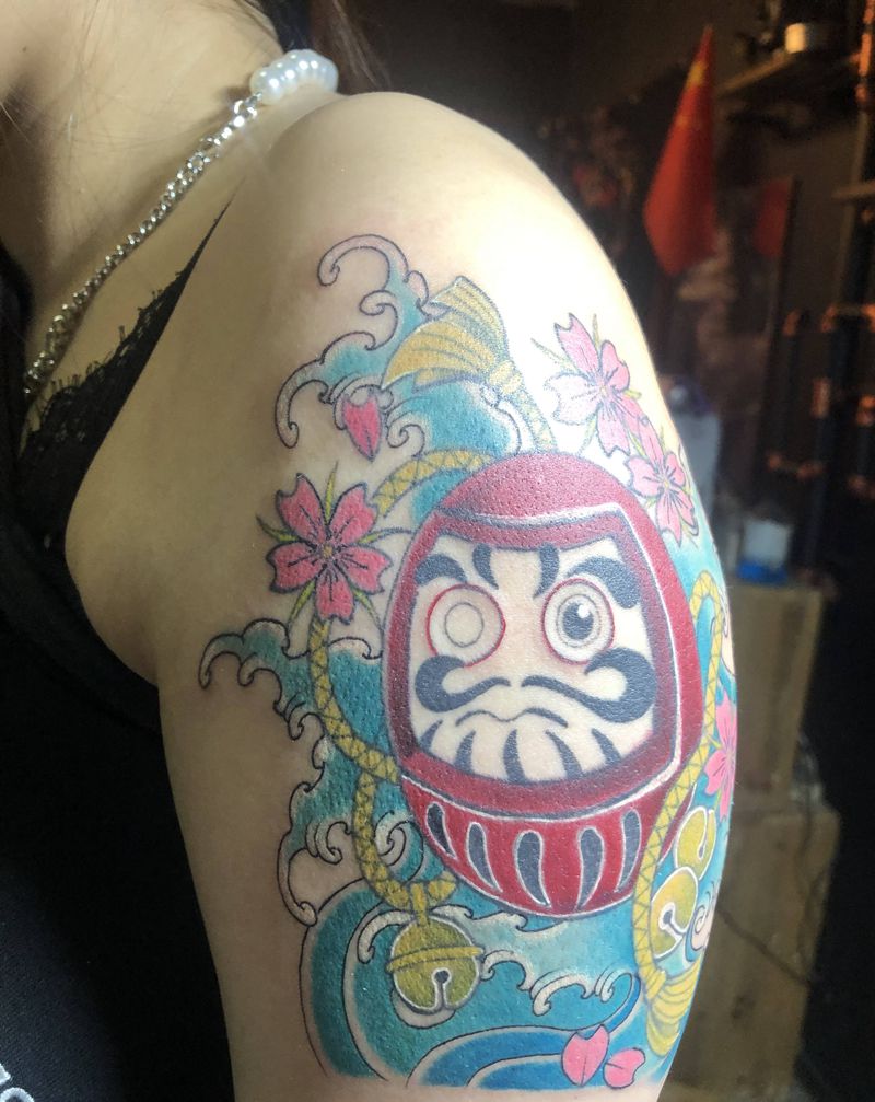 当前位置: 首页 >陕西省西安市纹身店-青雲刺青纹身图案>达摩蛋 修改添加纹身图片_手臂手部新传统New School纹身图案