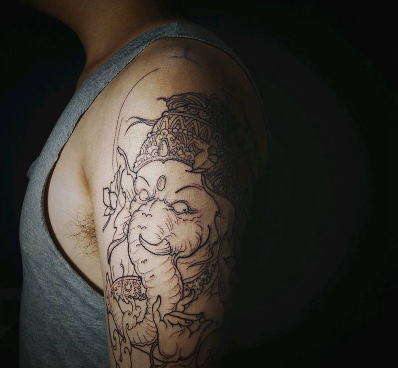 当前位置: 首页 >陕西省西安市纹身店-青雲刺青纹身图案>象神线条纹身图片_手臂新传统纹身图案
