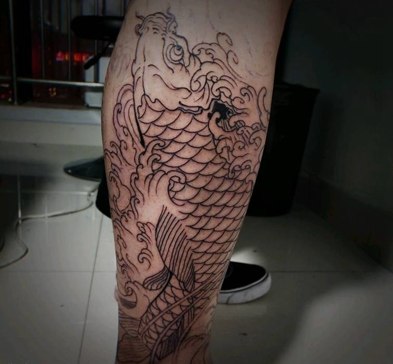 • T网红王老大花腿龙纹身图片_腿部新传统纹身图案