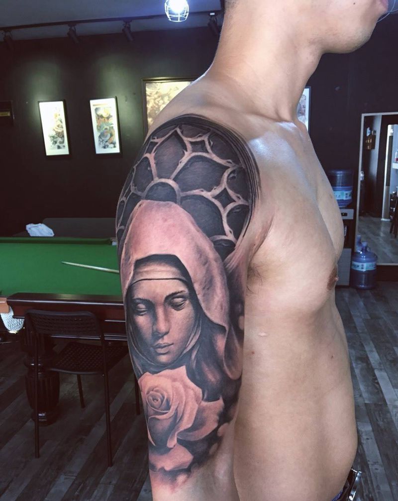 当前位置: 首页 >陕西省西安市纹身店-留白刺青纹身图案>圣母纹身图片_西安义刺青人物宗教肖像写实手臂成品纹身图案
