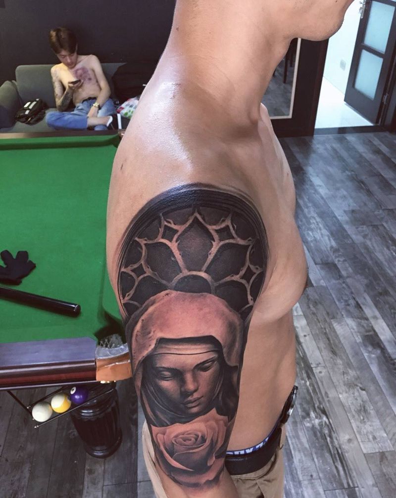 当前位置: 首页 >陕西省西安市纹身店-留白刺青纹身图案>圣母纹身图片_西安义刺青人物宗教肖像写实手臂成品纹身图案