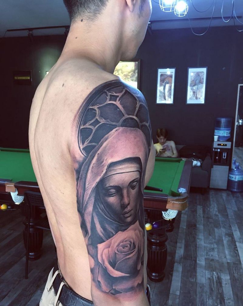 圣母纹身图片_西安义刺青人物宗教肖像写实手臂成品纹身图案