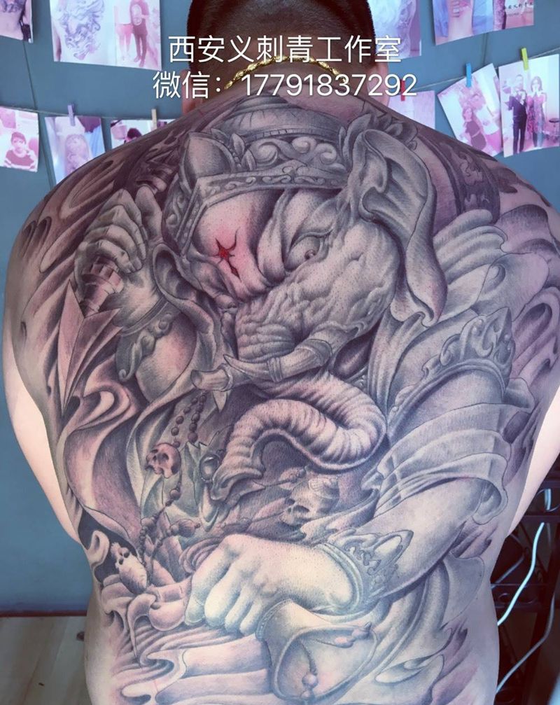 当前位置: 首页 >陕西省西安市纹身店-留白刺青纹身图案>满背象神纹身图片_成品背部传统鬼神动物纹身图案