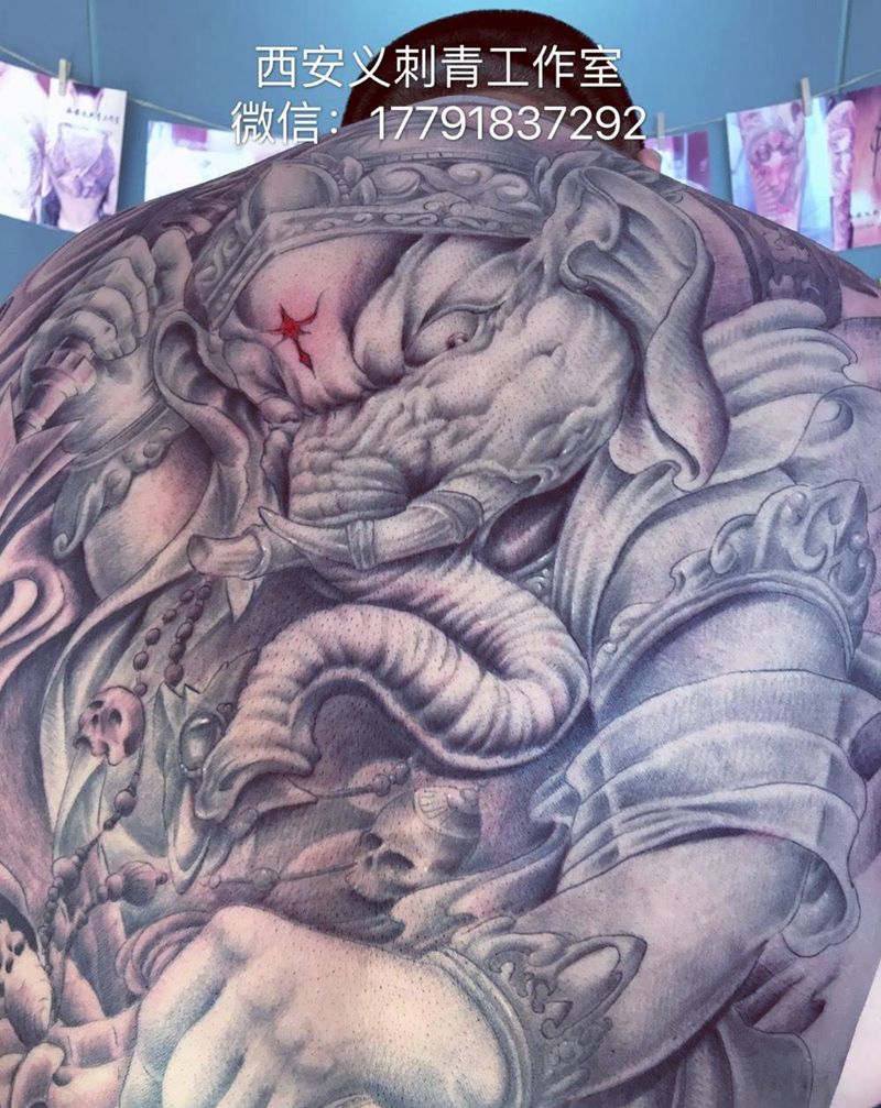 当前位置: 首页 >陕西省西安市纹身店-留白刺青纹身图案>满背象神纹身图片_成品背部传统鬼神动物纹身图案