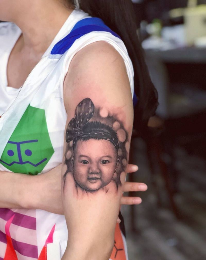 宝宝肖像纹身图片_西安义刺青原创人物欧美写实成品手臂纹身图案