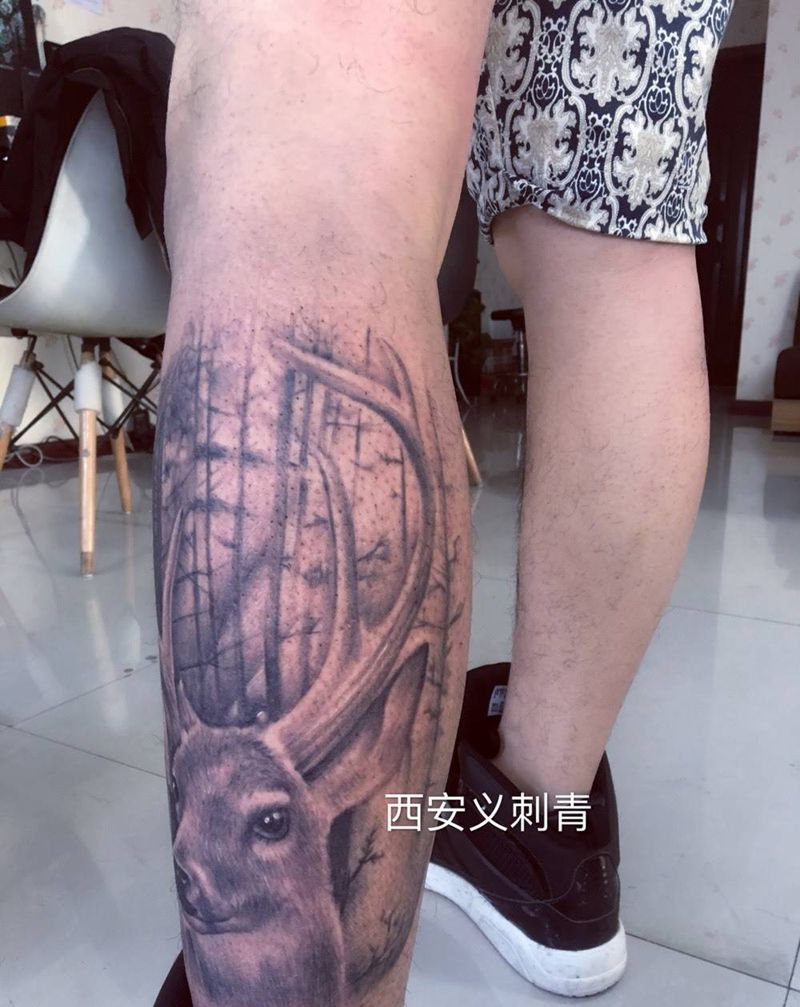 鹿纹身图片_成品腿部写实欧美动物西安义刺青纹身图案