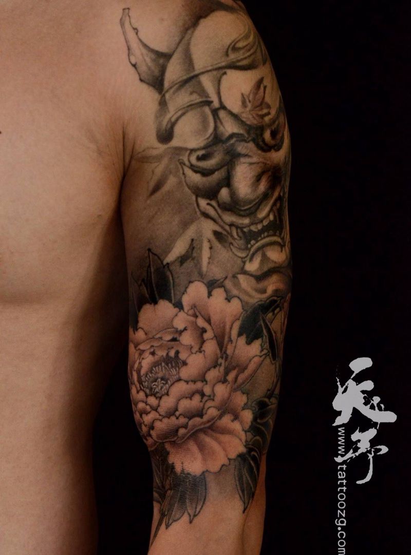 西安天予刺青传统作品纹身图片_般若成品传统鬼神原创西安黑灰彩色手臂手部纹身图案