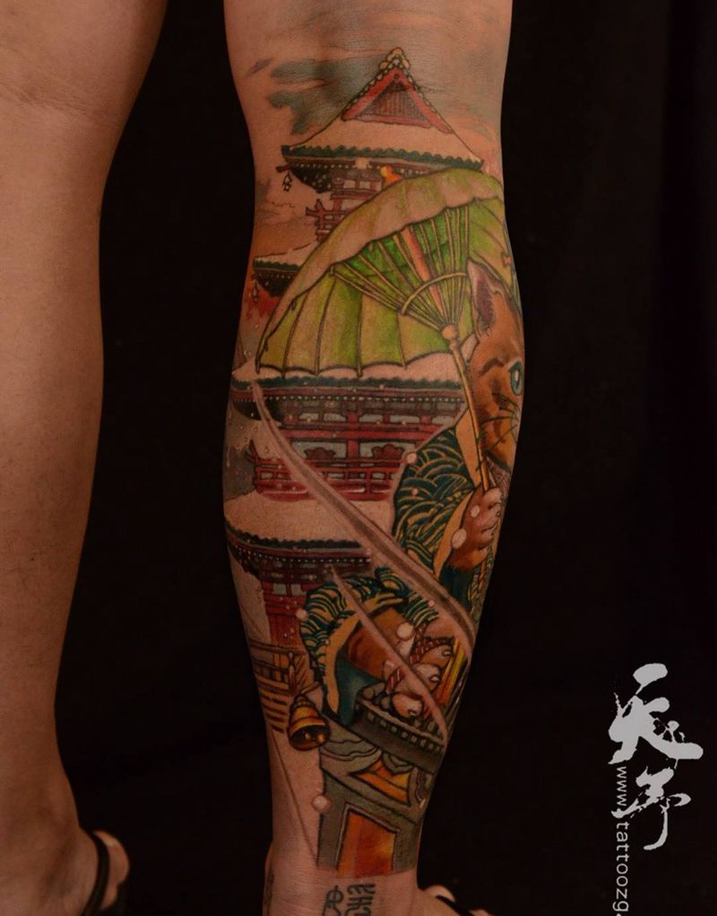 西安天予刺青传统作品纹身图片_成品腿部脚部传统动物原创西安黑灰彩色招财猫纹身图案