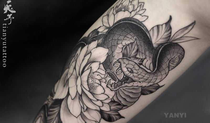 当前位置: 首页 >陕西省西安市纹身店-西安天予刺青纹身图案>小腿黑灰作品:蛇与花完成纹身图片_腿部几何图腾纹身图案