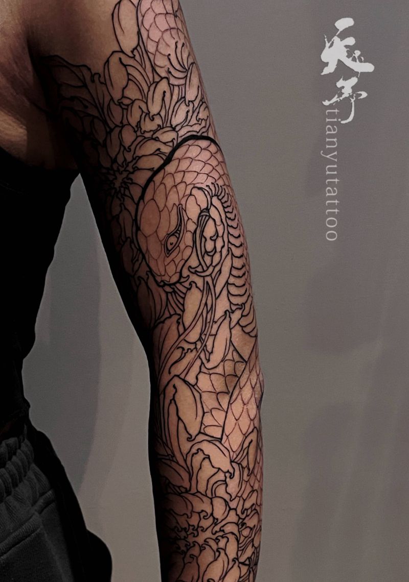 花臂:蛇与菊 未完成纹身图片_手臂新传统老传统纹身图案