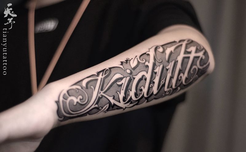 当前位置: 首页 >陕西省西安市纹身店-西安天予刺青纹身图案>花体字:Kidult纹身图片_手臂花体字纹身图案