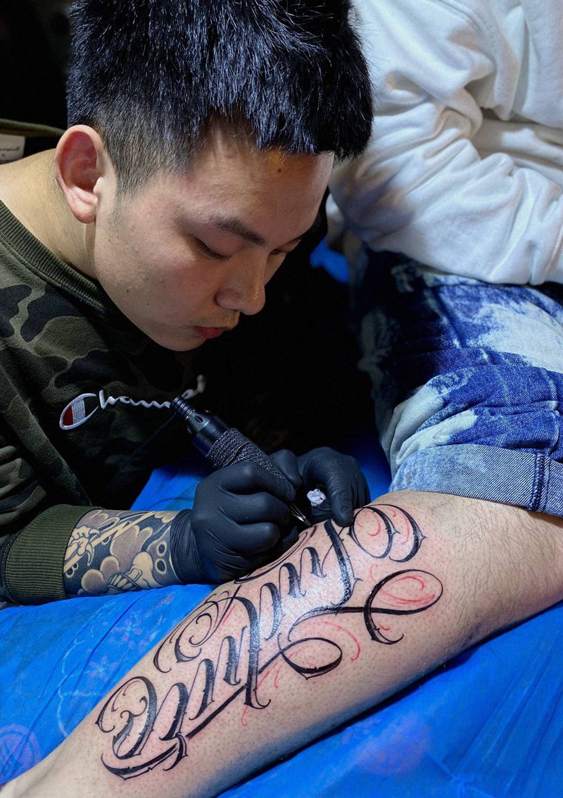 当前位置: 首页 >陕西省西安市纹身店-陕西同道堂文化传播有限公司纹身图案>花体字纹身纹身图片_手臂Old School花体字纹身图案
