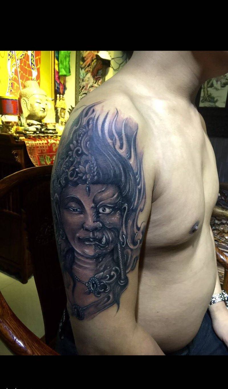 佛与魔纹身图片_西安原创宗教欧美传统肩部成品手稿纹身图案