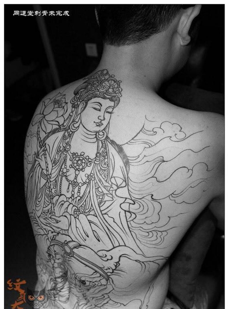 西安纹身#佛像纹身勾线纹身图片_传统肖像国画原创宗教背部胸部腿部纹身图案
