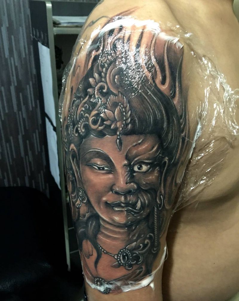 西安纹身#佛魔一念间纹身图片_西安西安刺青写实传统肖像原创宗教肩部手臂人物纹身图案