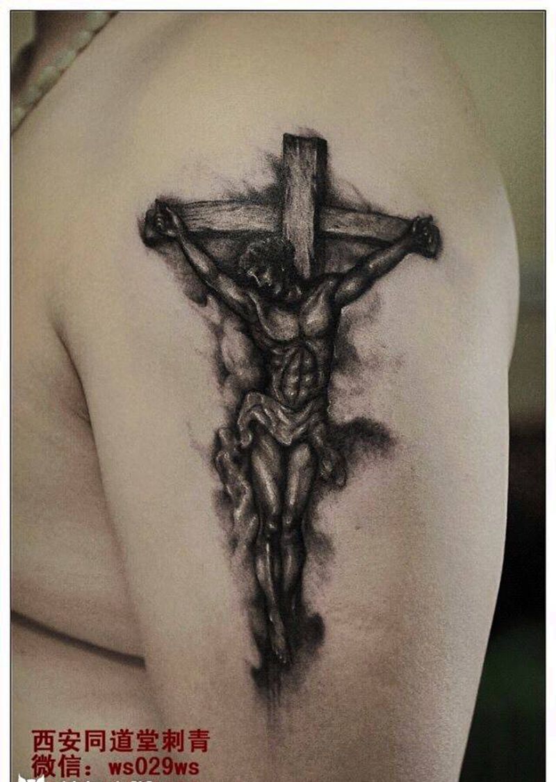 西安纹身#耶稣受难纹身图片_西安西安刺青宗教人物原创欧美肖像手臂手稿纹身图案