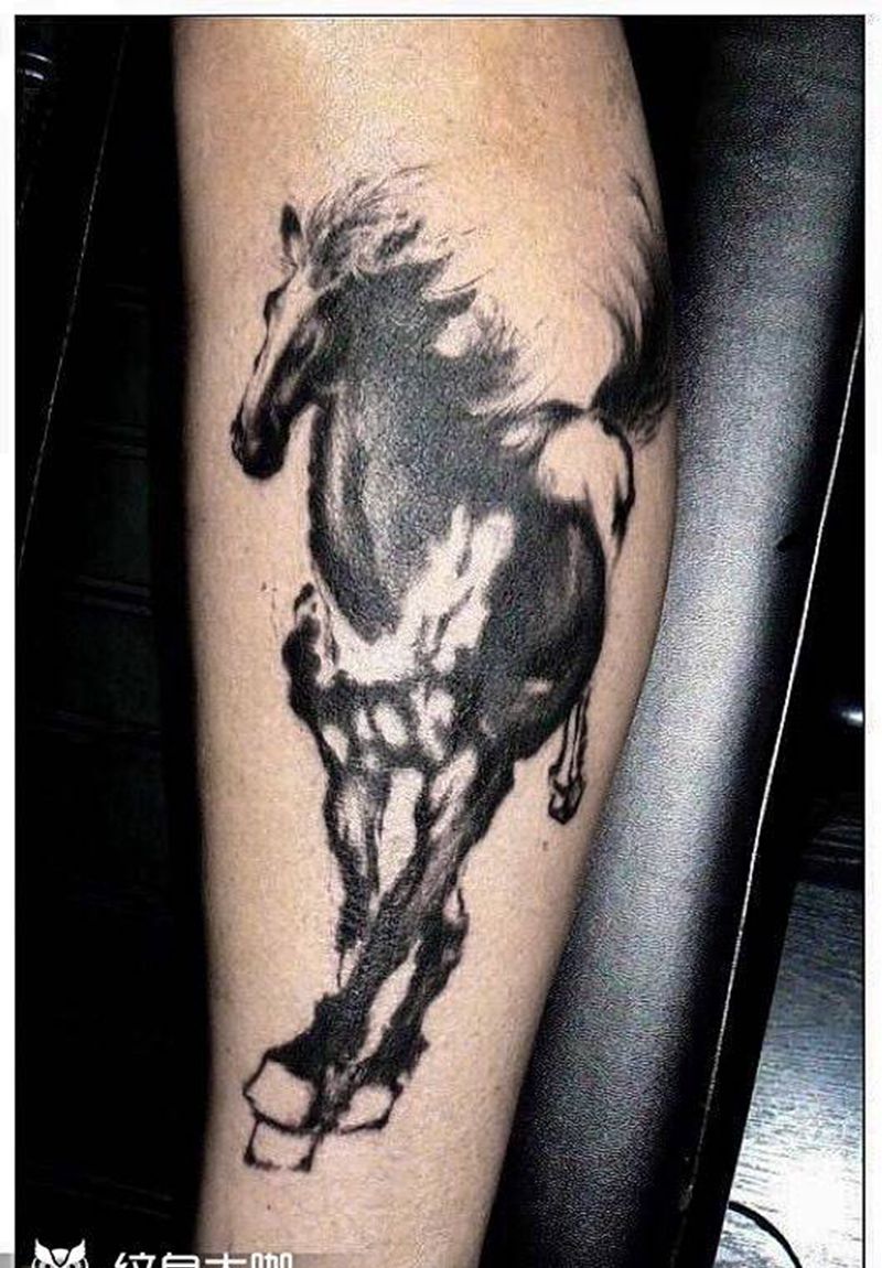 西安纹身#水墨奔马图纹身图片_西安西安刺青修改原创动物欧美传统国画腿部手稿纹身图案
