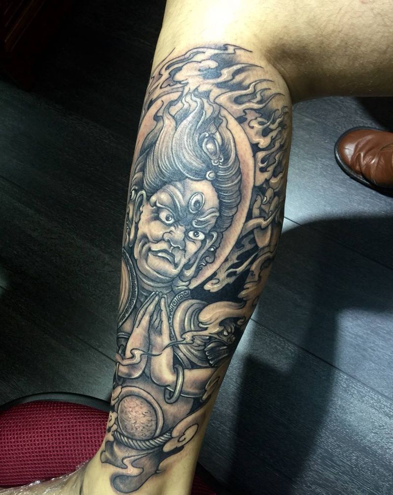 明王纹身纹身图片_成品手稿插画腿部传统写实原创鬼神宗教西安改纹身图案