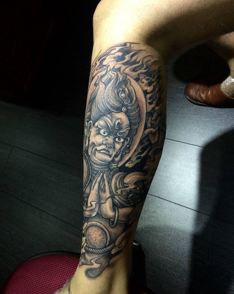 明王纹身纹身图片_成品手稿插画腿部传统写实原创鬼神宗教西安改纹身图案
