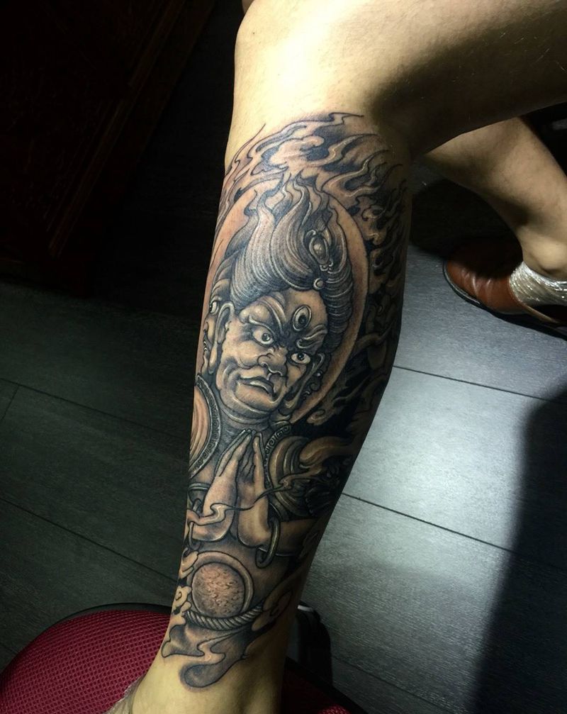 明王纹身纹身图片_成品手稿插画腿部传统写实原创鬼神宗教西安改纹身图案