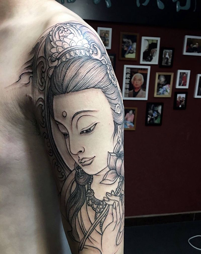 观音菩萨纹身图片_成品手稿肩部肖像传统写实国画鬼神宗教纹身图案