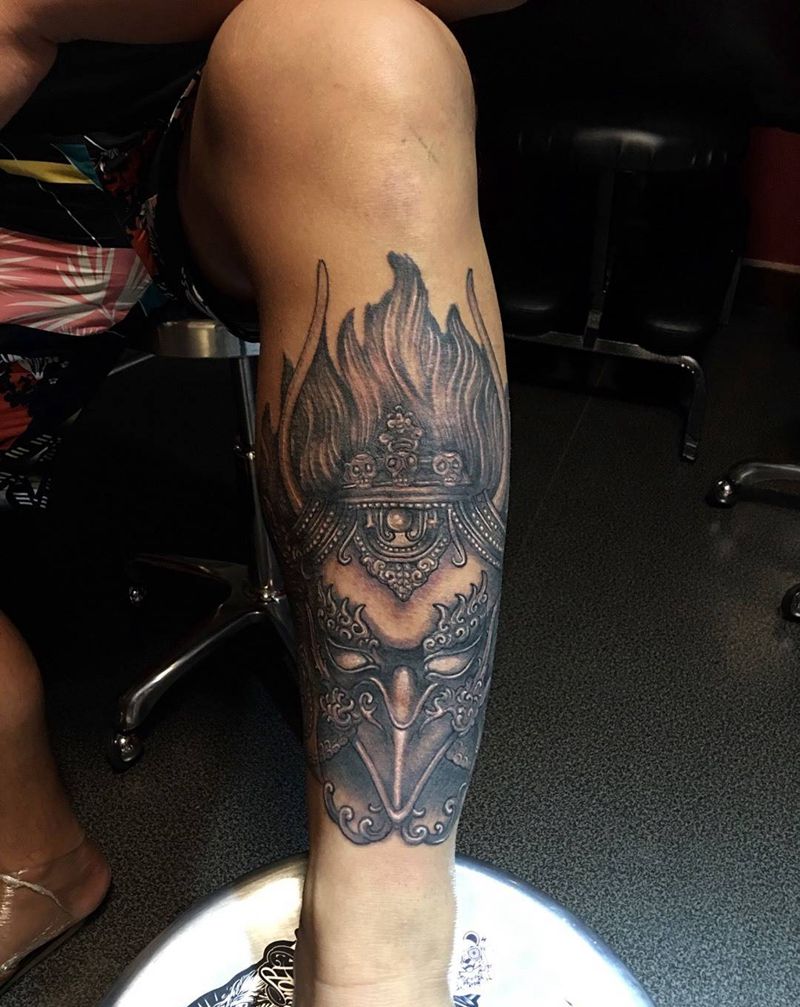 • T包小腿吹火男+阿多福纹身图片_腿部老传统新传统吹火男阿