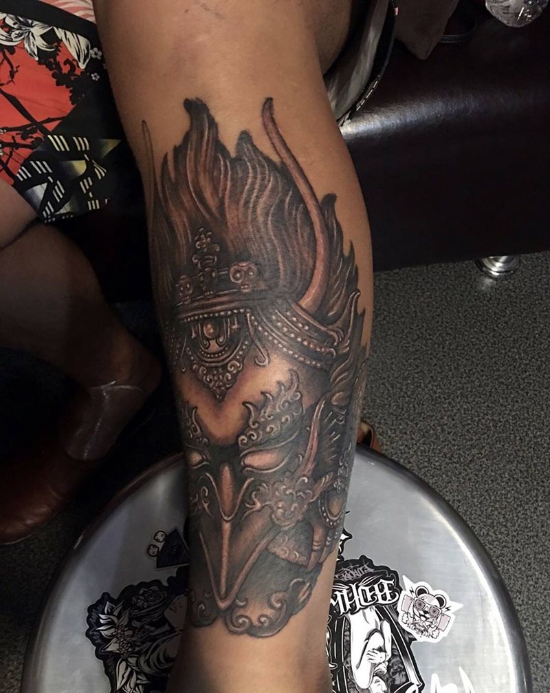 • T包小腿吹火男+阿多福纹身图片_腿部老传统新传统吹火男阿