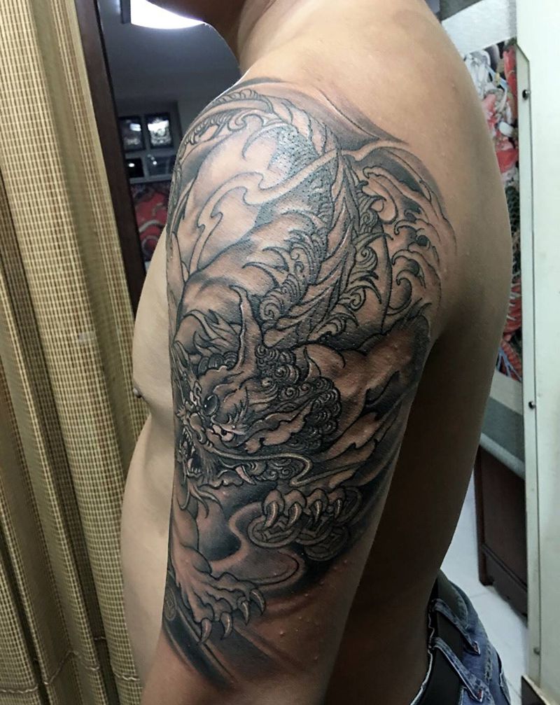 • T网红王老大花腿龙纹身图片_腿部新传统纹身图案