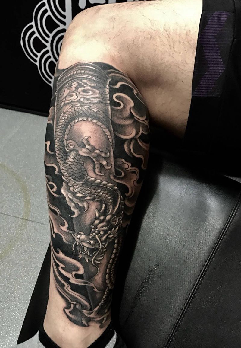 • T网红王老大花腿龙纹身图片_腿部新传统纹身图案