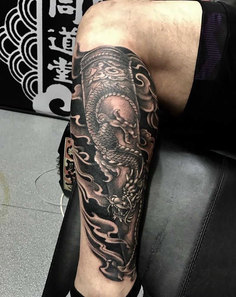 • T网红王老大花腿龙纹身图片_腿部新传统纹身图案