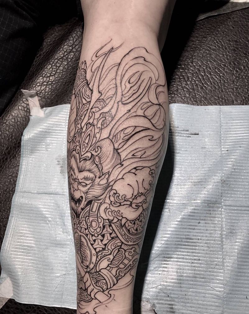 当前位置: 首页 >陕西省西安市纹身店-陕西同道堂文化传播有限公司纹身图案>大圣归来!纹身图片_西安修改肖像人物宗教鬼神原创传统成品腿部纹身图案