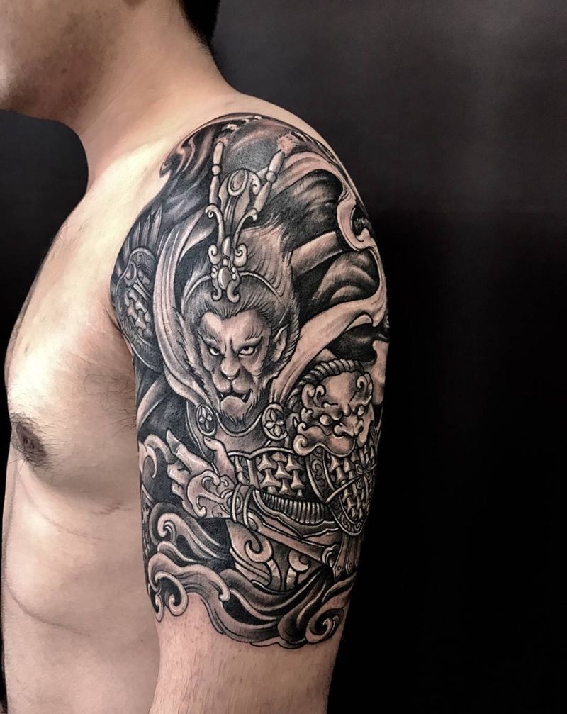 当前位置: 首页 >陕西省西安市纹身店-陕西同道堂文化传播有限公司纹身图案>斗战胜佛纹身图片_英文西安修改肩部手臂鬼神宗教传统原创纹身图案