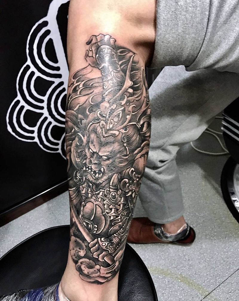 当前位置: 首页 >陕西省西安市纹身店-陕西同道堂文化传播有限公司纹身图案>大圣归来纹身图片_西安刺青修改西安鬼神原创传统腿部手稿成品纹身图案