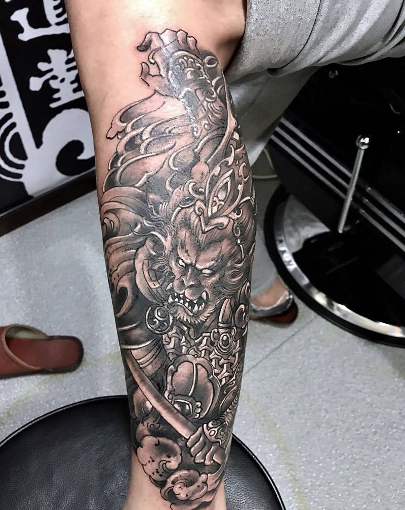 大圣归来纹身图片_西安刺青修改西安鬼神原创传统腿部手稿成品纹身图案