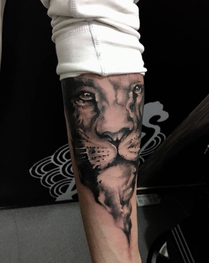 当前位置: 首页 >陕西省西安市纹身店-陕西同道堂文化传播有限公司纹身图案>狮子纹身图片_西安手臂欧美传统肖像动物原创写实纹身图案