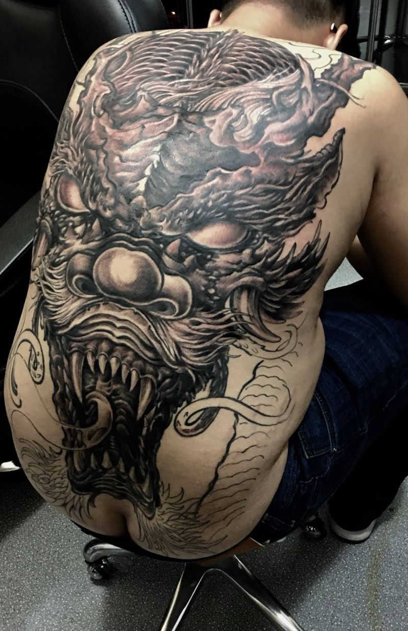 当前位置: 首页 >陕西省西安市纹身店-陕西同道堂文化传播有限公司纹身图案>神龙纹身图片_成品手稿背部传统国画动物鬼神图腾纹身图案