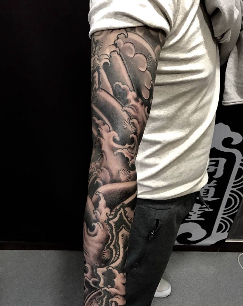 当前位置: 首页 >陕西省西安市纹身店-陕西同道堂文化传播有限公司纹身图案>花臂浪花加胸胛纹身图片_西安修改英文肖像成品手稿原创传统写实纹身图案