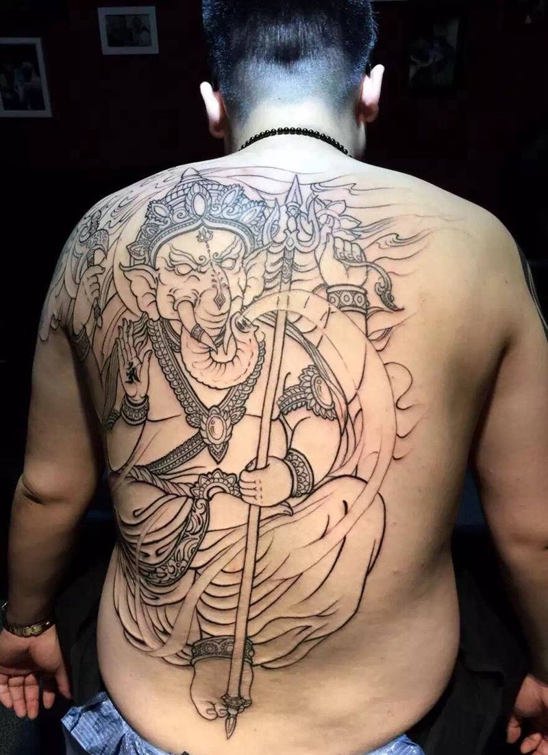 当前位置: 首页 >陕西省西安市纹身店-陕西同道堂文化传播有限公司纹身图案>象神纹身图片_修改肖像西安成品背部人物鬼神原创传统写实纹身图案