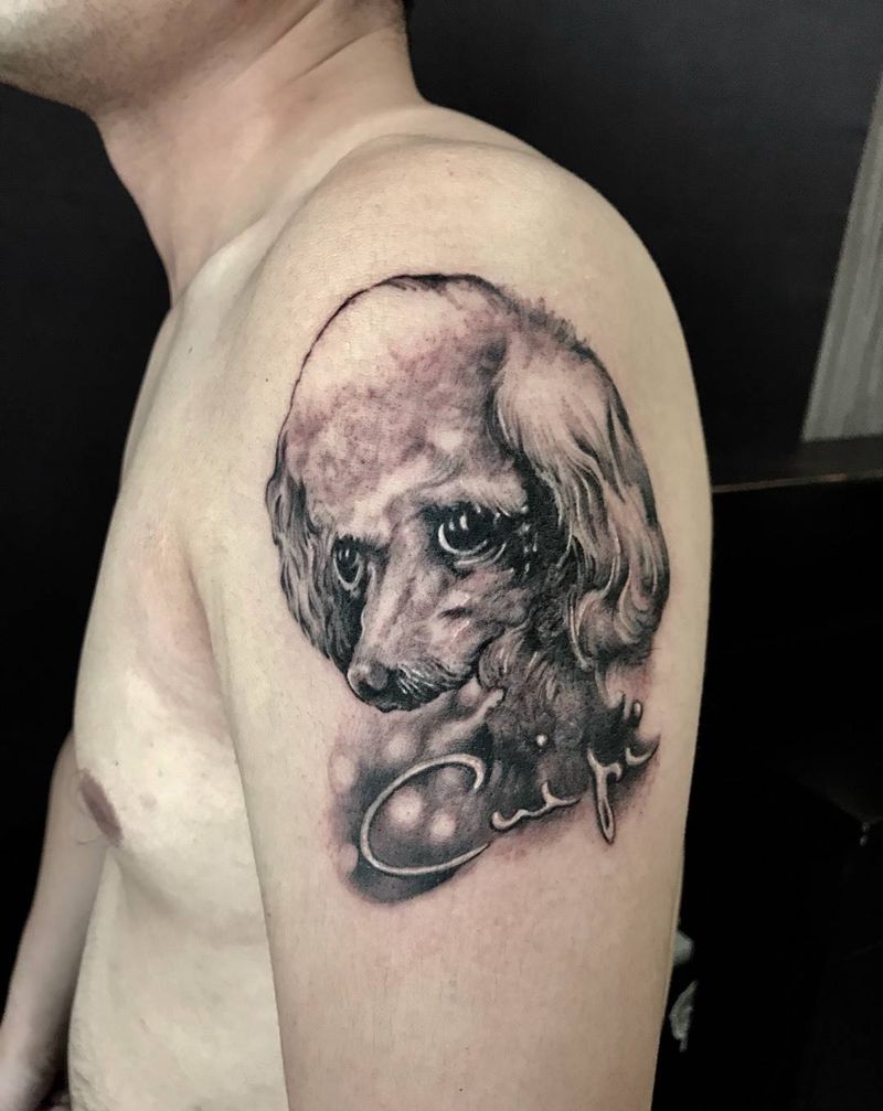 当前位置: 首页 >陕西省西安市纹身店-陕西同道堂文化传播有限公司纹身图案>狗狗纹身图片_西安小西安刺青修改肖像动物肩部手稿成品纹身图案