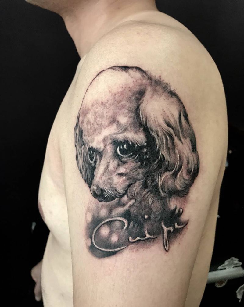 当前位置: 首页 >陕西省西安市纹身店-陕西同道堂文化传播有限公司纹身图案>狗狗纹身图片_西安小西安刺青修改肖像动物肩部手稿成品纹身图案
