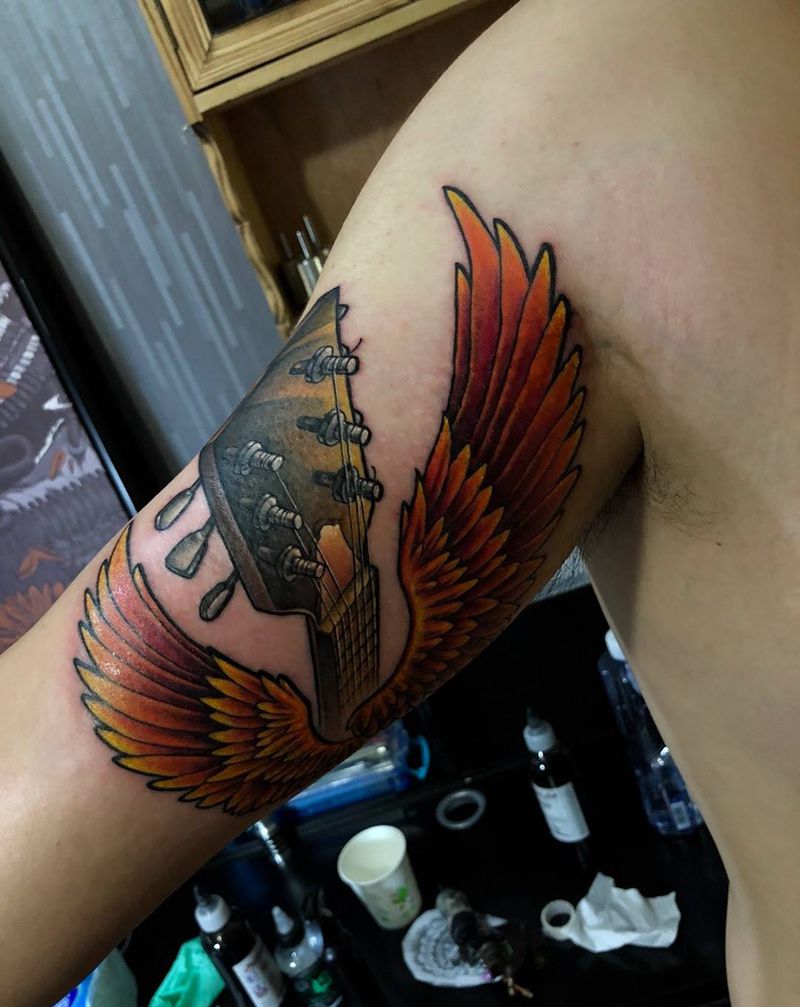 吉他翅膀!纹身图片_西安刺青西安西安改原创欧美传统手臂手稿成品纹身图案