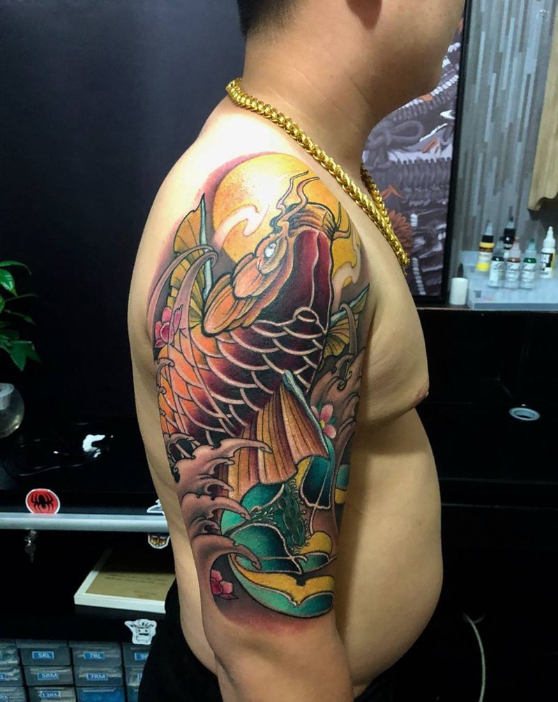 大臂锦鲤纹身图片_西安刺青西安西安改传统动物手臂手稿成品国画纹身图案