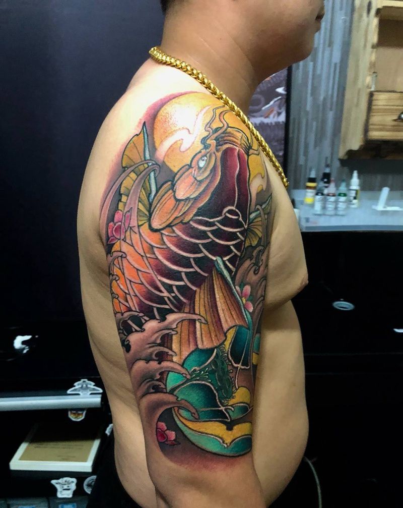 大臂锦鲤纹身图片_西安刺青西安西安改传统动物手臂手稿成品国画纹身图案