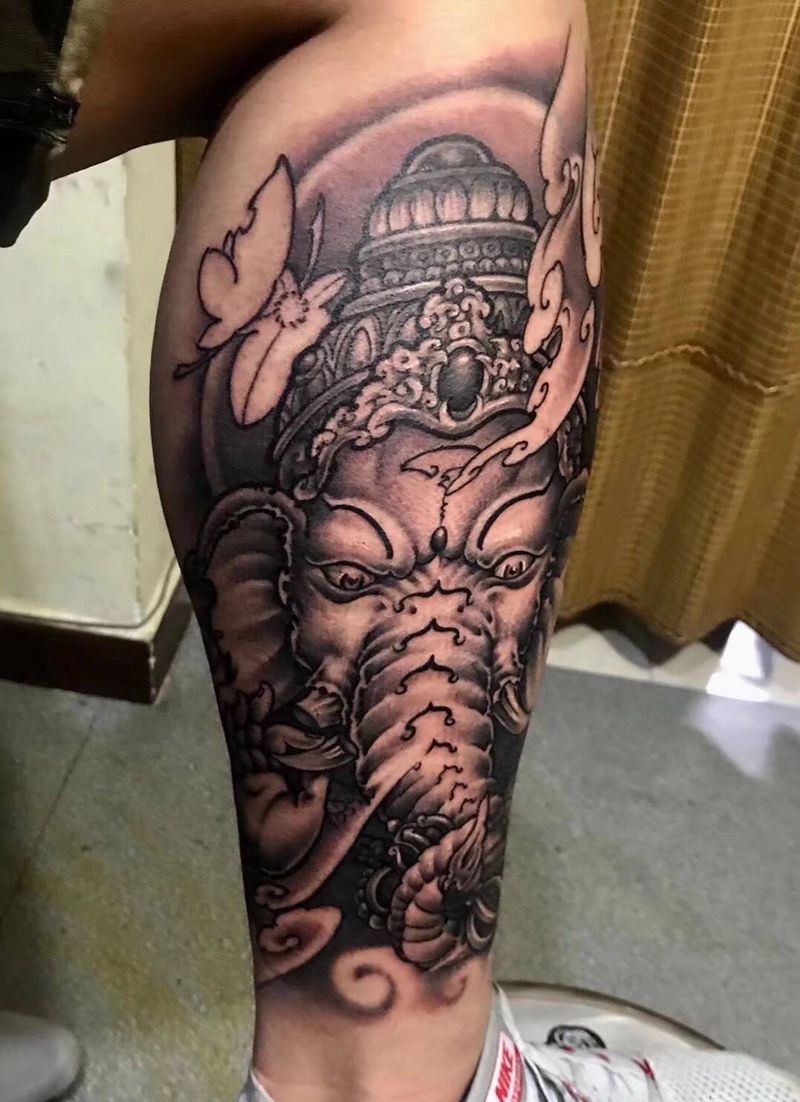 当前位置: 首页 >陕西省西安市纹身店-陕西同道堂文化传播有限公司纹身图案>象神纹身纹身图片_西安刺青西安改西安宗教人物传统腿部成品手稿纹身图案